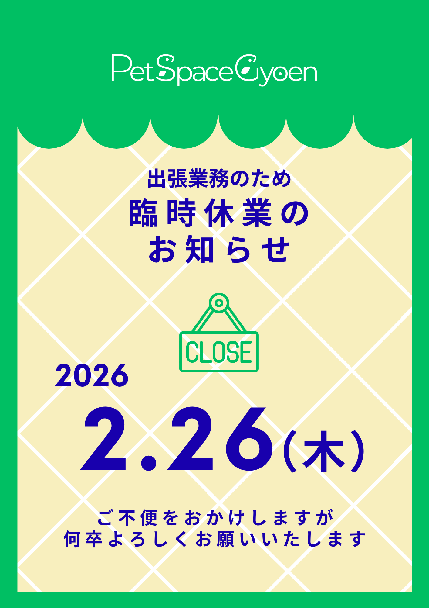 おしらせ 🔴2026/02/26(木)臨時休業のお知らせ おしらせ 2026.02.19 2026/02/26(木)は、出張業務のため臨時休業いたします。 また、02/25(水)は定休日です。 お問い合わせや発送業務もお休みいたしますのでご了承ください。